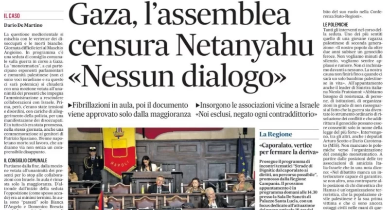Il Mattino di Napoli ha considerato che la vicenda non fosse abbastanza importante per la prima pagina di ieri. E quindi ha messo a pagina 27 la notizia della mozione antisemita adottata all’unanimità dal Consiglio comunale di Napoli. Un paio di colonne di neutra cronaca, che opportunamente ometteva di riferire alcunché dello slogan genocidiario (“Palestina libera dal fiume al mare”) che risuonava nell’Aula durante la discussione (il pubblico, rigorosamente Judenfrei, era affollato di sigle palestinesi).